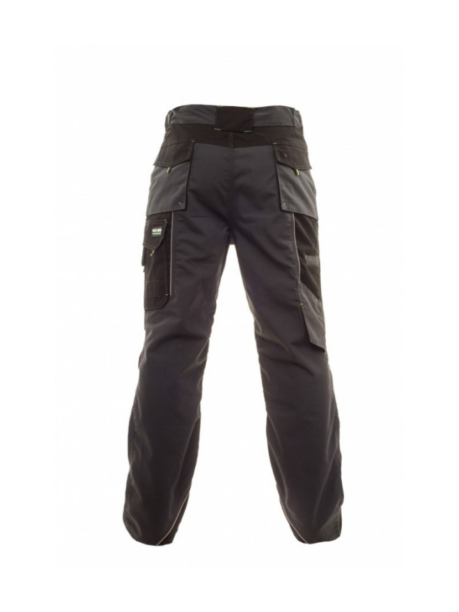 Рабочие брюки с зелеными деталями и приподнятой задней частью, изготовленные из Canvas - высокопрочной и устойчивой к истиранию тканой ткани. Колени и низ брюк усилены практичной и устойчивой к истиранию тканью 600D. Снаружи можно вставить коленный протектор. Очень вместительные и функциональные боковые карманы позволяют удобно хранить рабочие инструменты. Боковые карманы имеют дополнительный карман для телефона и ручек слева и карман для инструментов справа. В нижней части карманов имеются светоотражающие полоски для лучшей видимости.